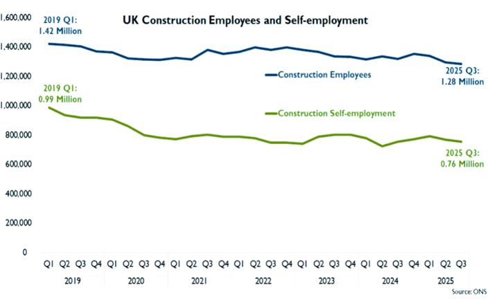 The decline is visible across the two main parts of the workforce. Employee numbers within construction have fallen by around 140,000 since 2019, while self-employment has dropped by almost a quarter of a million. These shifts reflect reduced sector activity rather than a shortage of professional design staff. They underline a quieter market overall, where fewer projects are being delivered and confidence has weakened.