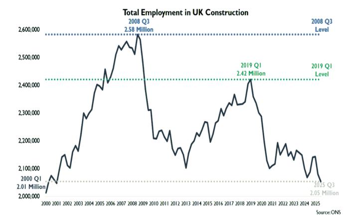 The long-term picture reinforces this slowdown. As shown below, total construction employment has been decreasing for more than a decade. After previous peaks in 2008 and 2019, the workforce has continued to shrink, falling to just over 2.05 million people in Q3 2025. This reduction is not caused by a shortage of architects or engineers. It simply mirrors the lower level of work progressing to site, particularly in housing and commercial development.